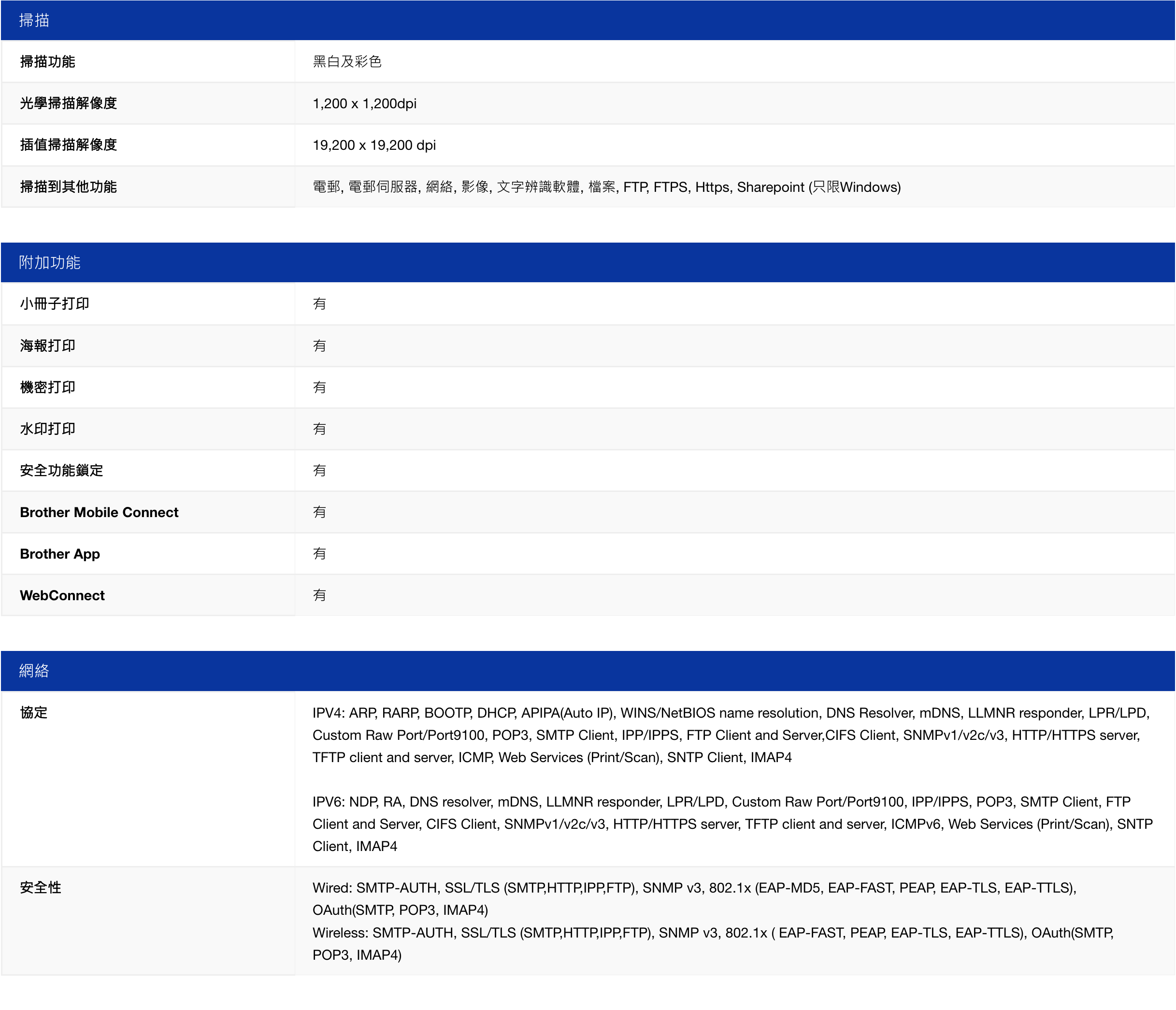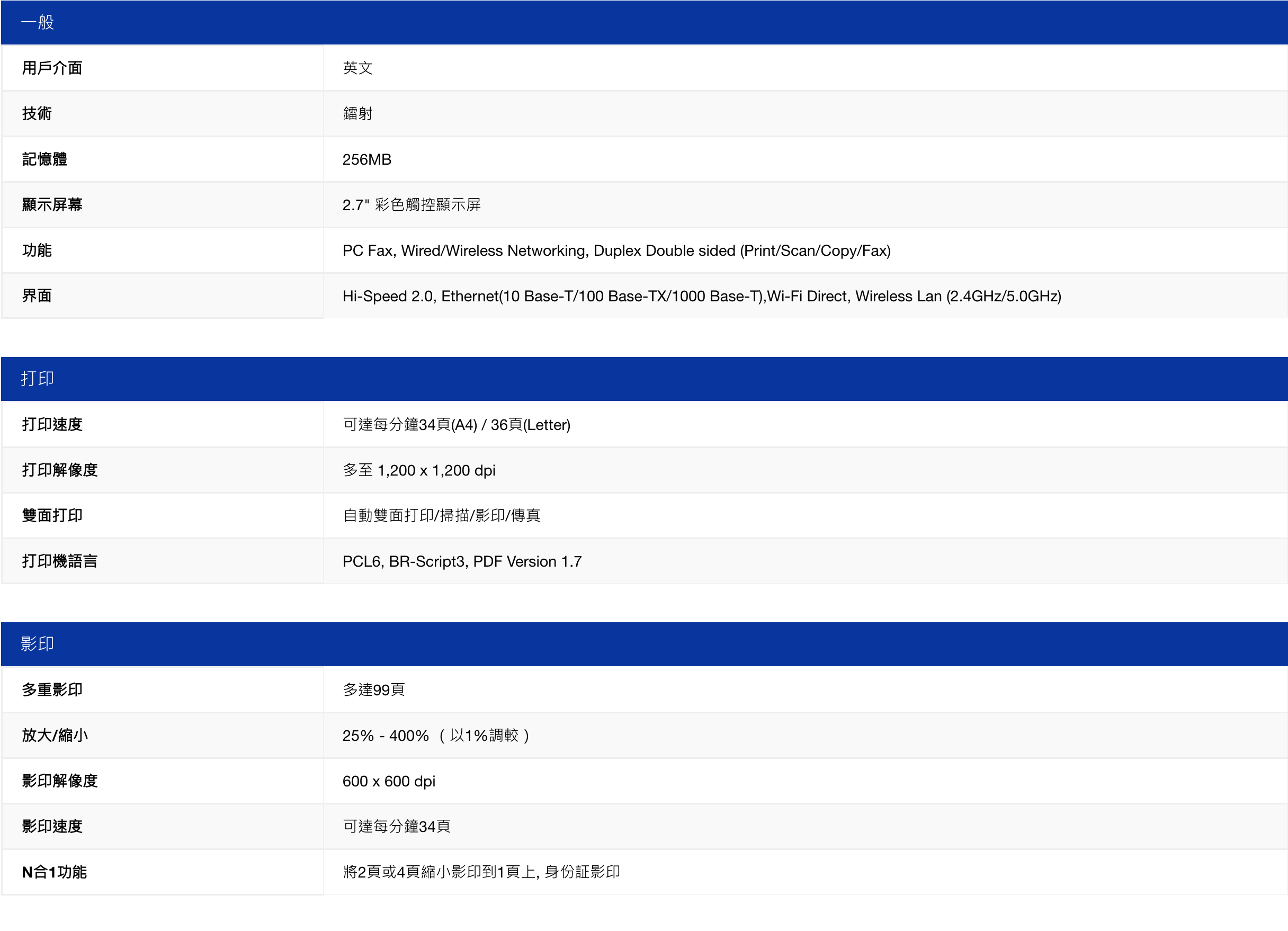 -黑白打印/彩色掃描/黑白影印/傳真/ 有線/無線網絡/WiFi